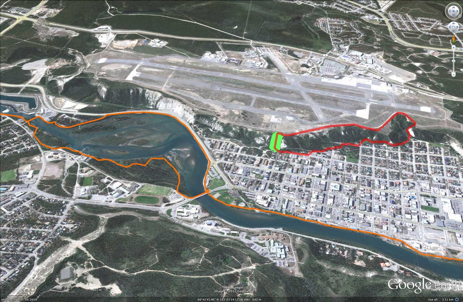 Locating the stairs behind the ball diamonds across from Yukon Energy on Robert Service Way offers a very strategic location for a piece of trail infrastructure. A set of stairs (green patch) here would have a lot of impact in developing a culture of recreational walking. Imagine the broad appeal of incorporating the Airport Perimeter Trail, Millenniuum Trail, the Black Street Stairs and the Rotary Centennial Bridge into a 7.6 km loop trail (red trail).