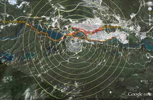 Let's look at the Ball Diamond Stairs from a walker's perspective. What would it mean to people living in Riverdale? It's pretty obvious that Ball Diamond Stairs will draw Riverdale walkers to the Airport Perimeter Trail. Look at this distance map centered on the new Riverdale roundabout (the circles are in .5 km increments). Recreational walkers will often take longer walks if there is a good loop. With our long summer evenings, 1-2 hour hikes are well within many people's evening walking capabilities.